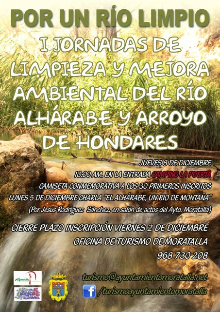 El próximo día 8 de diciembre de 2016, se celebrarán unas jornadas de participación ciudadana y voluntariado, organizado por la asociación Mosaico del Noroeste y con la colaboración de la Concejalía de Medio Ambiente del Ayuntamiento de Moratalla y la asociación Descubriendo Moratalla. La actividad tiene como fin, explicar los valores ambientales de los ríos en general, y del Alhárabe y el Hondares en particular. Las jornadas se abrirán con una charla impartida por Jesús Rodríguez Sánchez el lunes 5 de diciembre a las 19:30 en la Casa de la Mujer de Moratalla . Posteriormente, el jueves 8 de diciembre, se realizará una limpieza con los voluntarios que se quieran sumar a la actividad, en varios puntos del río y el arroyo, que son especialmente visitados sobre todo en verano por ser buenas zonas de baño, donde al final de la estación quedan abundantes restos de basura, que se recogerán como parte final de la actividad. Para poder asistir a la jornada de voluntariado del domingo, será necesario inscribirse en la Oficina de Turismo hasta el viernes 2 de diciembre. A los primeros 30 inscritos, se les regalará una camiseta conmemorativa. La celebración de las jornadas, pretenden concienciar a la sociedad de la necesidad de conjugar el disfrute de la Naturaleza, con el respeto que ésta merece.