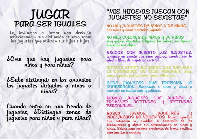 Por ello, ahora que estamos a las puertas de la Navidad, invitamos a padres y madres a analizar de forma crítica qué modelos estamos ofreciendo o reforzando a través de los juegos y los juguetes. Es por ello, que por estas fechas tienen una responsabilidad añadida a la hora de educar a los más pequeños; tienen la responsabilidad de darles la oportunidad de jugar libremente, siendo necesario contrarrestar la publicidad que nos presentan diferentes medios de comunicación ya que no reflejan precisamente un mundo basado en relaciones de igualdad, respeto y solidaridad, sino que aparecen cargados de valores sexistas, comportamientos agresivos, competitivos….