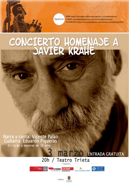 Para cerrar estas II Jornadas Educativas "Una educación para el S.XXI; Miradas desde las ciencias y las artes", se realizará el día 3 de marzo en el Teatro Trieta de Moratalla un Concierto Homenaje a Javier Krahe poeta y cantautor español conocido por usar la ironía y la comedia en sus canciones-. Para ello, las tablas del Trieta contarán con Vicente Palo y Eduardo Piqueras.