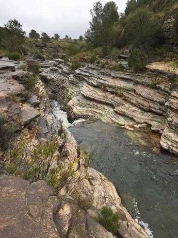 Al llegar al río Alhárabe, el sendero acompaña al lecho del río, donde abundan las pozas de agua y cascadas, sobre todo tras épocas lluviosas. Además, son importantes las curiosas estructuras sedimentarias, fallas, pliegues, cabalgamientos, antiguos deslizamientos y fósiles que hacen que éste sea un Lugar de Interés Geológico. Al final de esta ruta se encuentra un salto de falla por donde el agua cae formando una pequeña cascada.