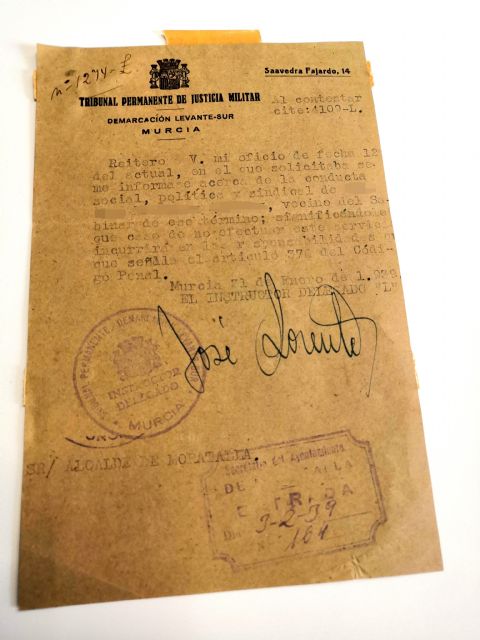 Se trata de un Oficio fechado el 31 de enero de 1939, en el que el Juez Instructor del Tribunal Permanente de Justicia Militar de la Demarcación Levante-Sur solicita al Alcalde la remisión de un informe sobre la conducta social, política y sindical de un vecino de El Sabinar.