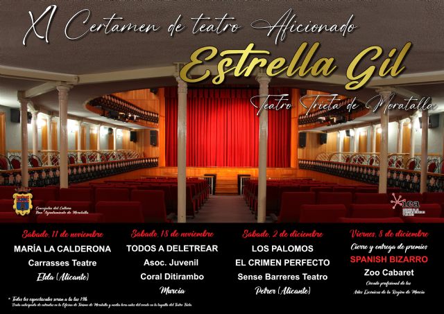 La fase de concurso de es XI Certamen de Teatro Aficionado "Estrella Gil", está programado para que se lleve a cabo durante los días 11 y 18 de noviembre y 2 de diciembre, siendo finalmente, la clausura y entrega de premios el 8 de diciembre de 2023. Todas las representaciones serán en el gran Teatro Trieta de Moratalla.