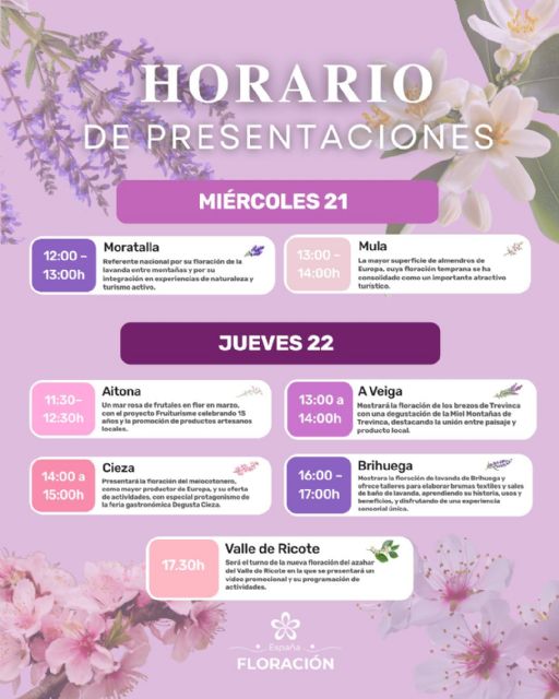 La programación se iniciará el miércoles 21, de 12:00 a 13:00 horas, con la presentación de Moratalla, referente nacional por su floración de la lavanda entre montañas y por su integración en experiencias de naturaleza y turismo activo. A continuación, de 13:00 a 14:00 horas, será el turno de Mula, con la primera floración del almendro de Europa con más de 20.000 hectáreas dedicadas a este cultivo, la mayor del país, y que ha convertido su floración en un producto turístico consolidado, con rutas, eventos y una fuerte implicación del tejido local.